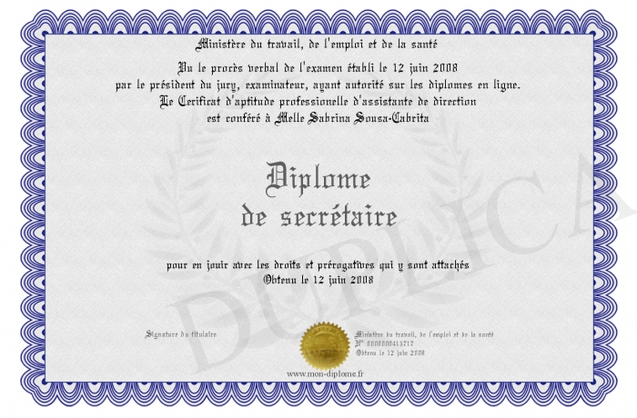 Envoyez par email votre Diplome de secrétaire personalisé