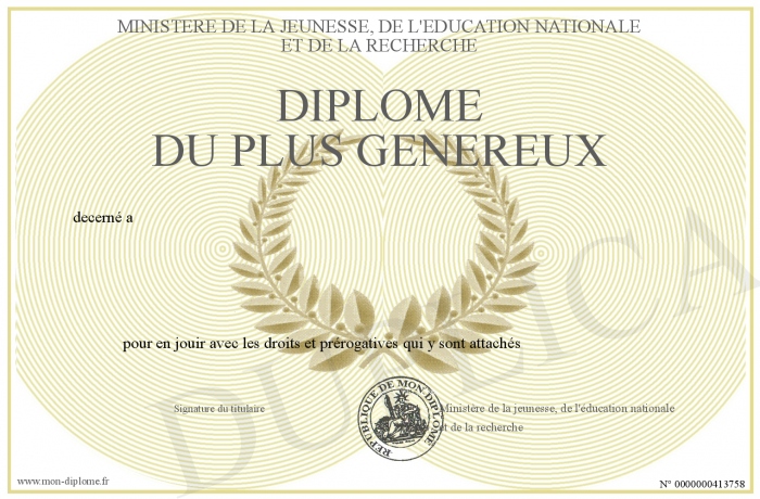 Envoyez par email votre DIPLOME DU PLUS GENEREUX personalisé