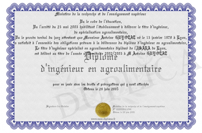 Envoyez par email votre Diplôme d'ingénieur en agroalimentaire personalisé