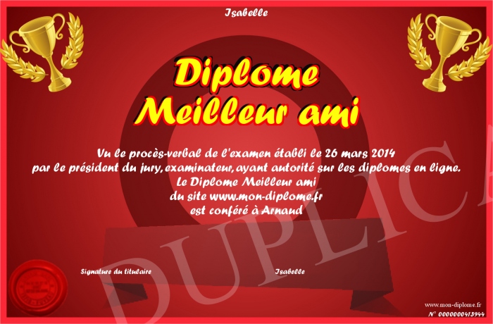 Envoyez par email votre Diplôme Meilleur ami personalisé