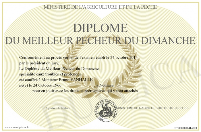 Envoyez par email votre DIPLOME DU MEILLEUR PECHEUR DU DIMANCHE personalisé