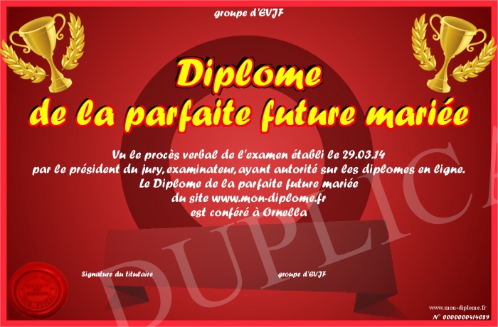 Envoyez par email votre Diplôme de la parfaite future mariée personalisé