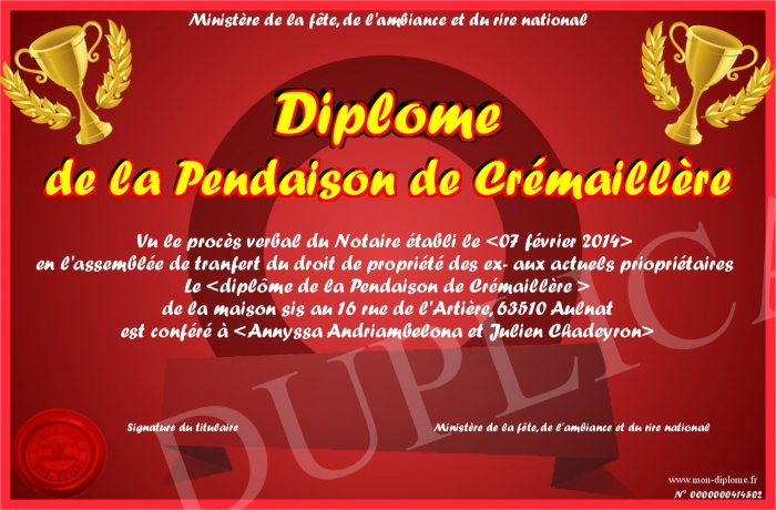 Envoyez par email votre Diplôme de la Pendaison de Crémaillère personalisé