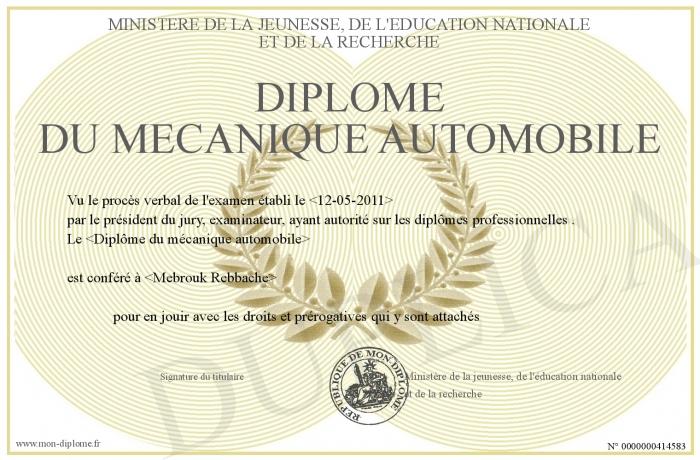 Envoyez par email votre Diplôme du mecanique automobile personalisé