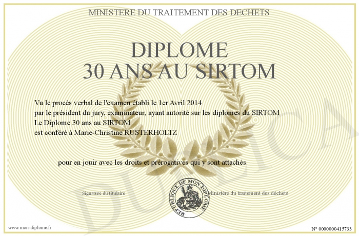 Envoyez par email votre Diplôme 30 ans au SIRTOM personalisé