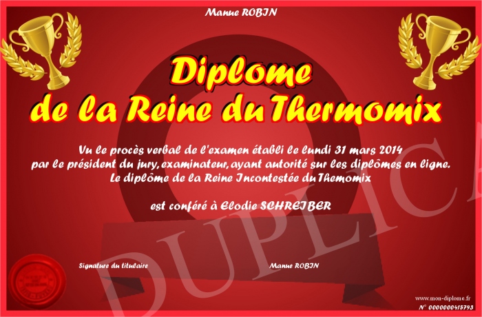 Envoyez par email votre Diplôme de la Reine du Thermomix personalisé