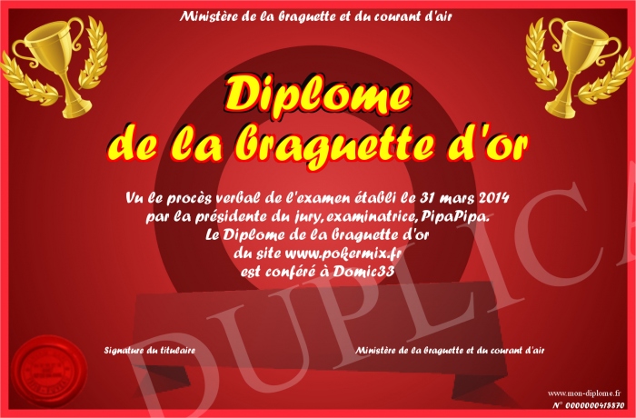 Envoyez par email votre Diplôme de la braguette d'or personalisé