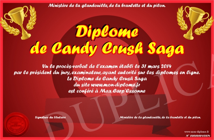 Envoyez par email votre Diplôme de Candy Crush Saga personalisé