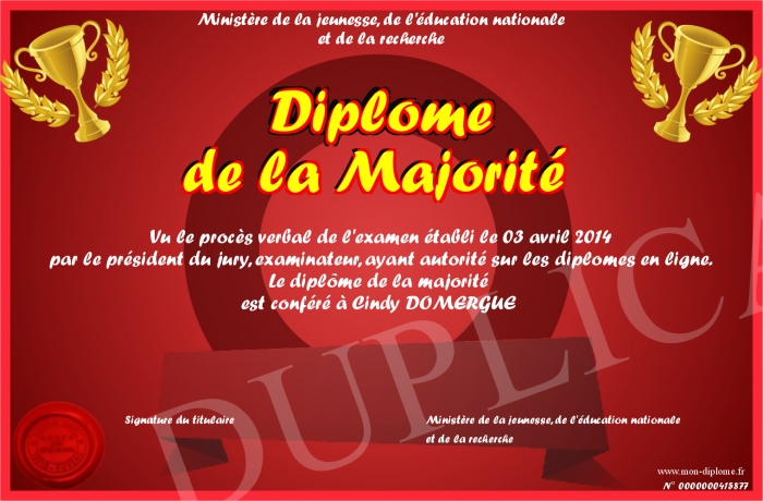 Envoyez par email votre Diplôme de la Majorité personalisé