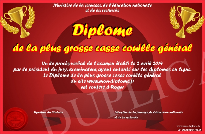 Envoyez par email votre Diplôme de la plus grosse casse couille général personalisé