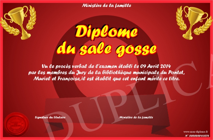 Envoyez par email votre Diplôme du sale gosse personalisé