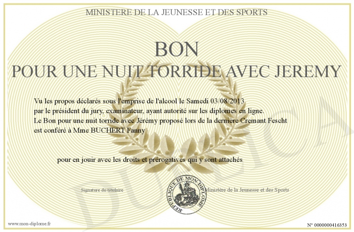 Envoyez par email votre Bon pour une nuit torride avec Jérémy personalisé