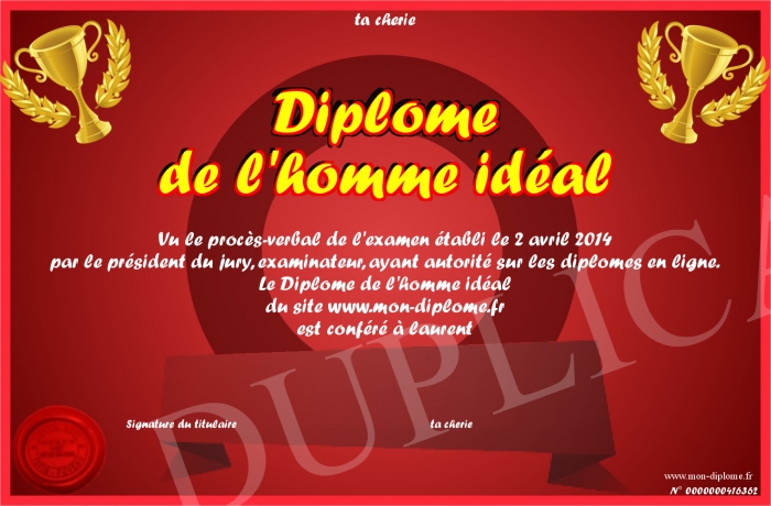 Envoyez par email votre Diplôme de l'homme idéal personalisé