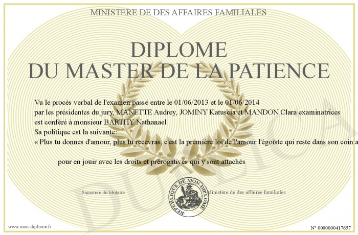 Envoyez par email votre Diplôme du Master de la PATIENCE personalisé