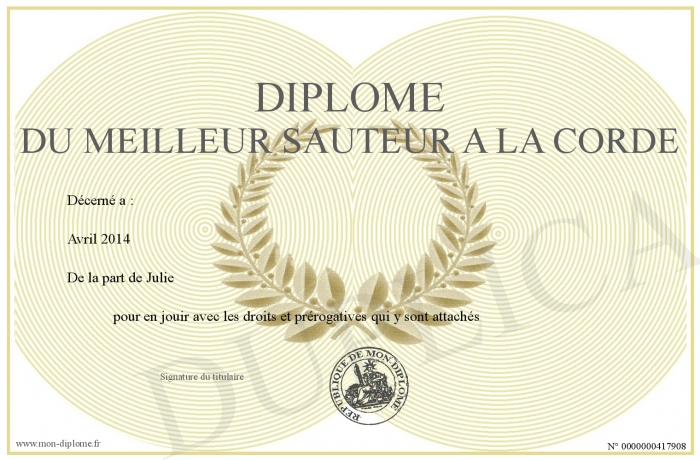 Envoyez par email votre Diplôme du meilleur sauteur a la corde personalisé