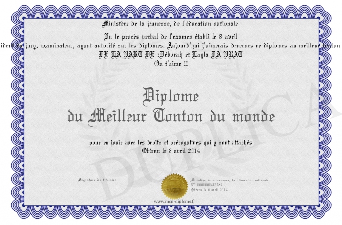 Envoyez par email votre Diplôme du Meilleur Tonton du monde personalisé