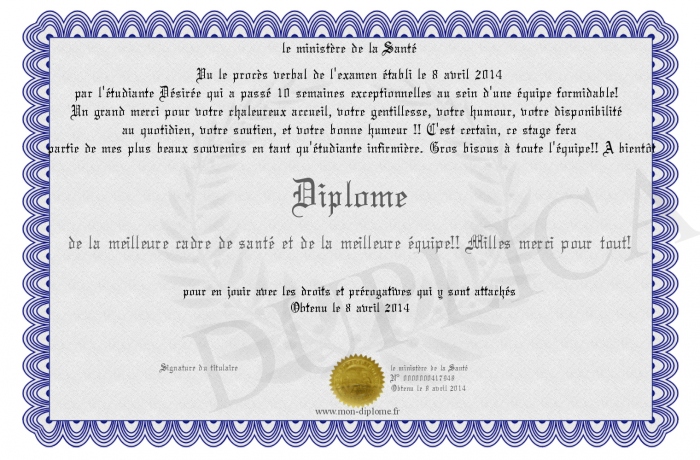 Envoyez par email votre Diplôme de la meilleure cadre de santé et de la meilleure équipe!! Milles merci pour tout! personalisé