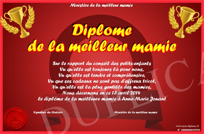 Envoyez par email votre Diplôme de la meilleur mamie personalisé