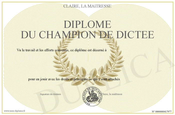 Envoyez par email votre Diplôme du Champion de dictée personalisé