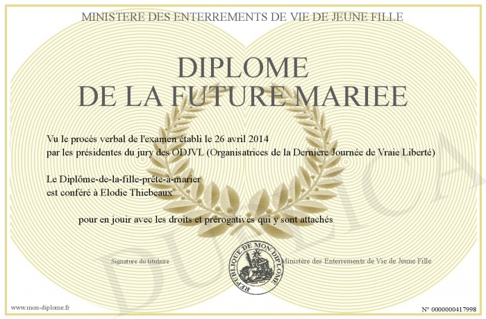 Envoyez par email votre Diplôme de la future mariée personalisé