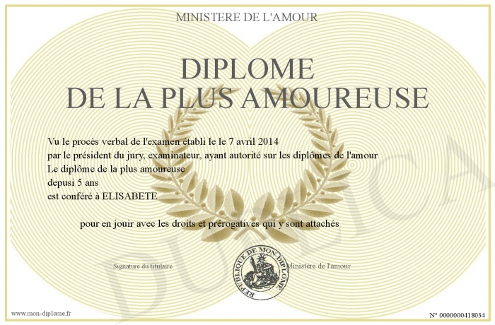 Envoyez par email votre Diplôme de la plus amoureuse personalisé
