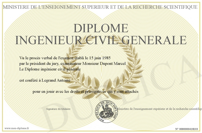 Envoyez par email votre Diplôme ingénieur civil générale personalisé