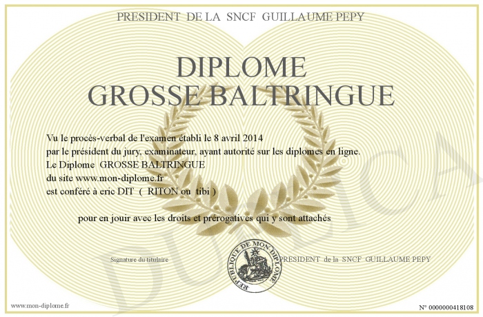 Envoyez par email votre Diplôme GROSSE BALTRINGUE personalisé