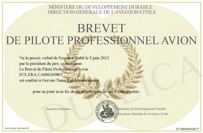 Envoyez par email votre Brevet de Pilote Professionnel Avion personalisé