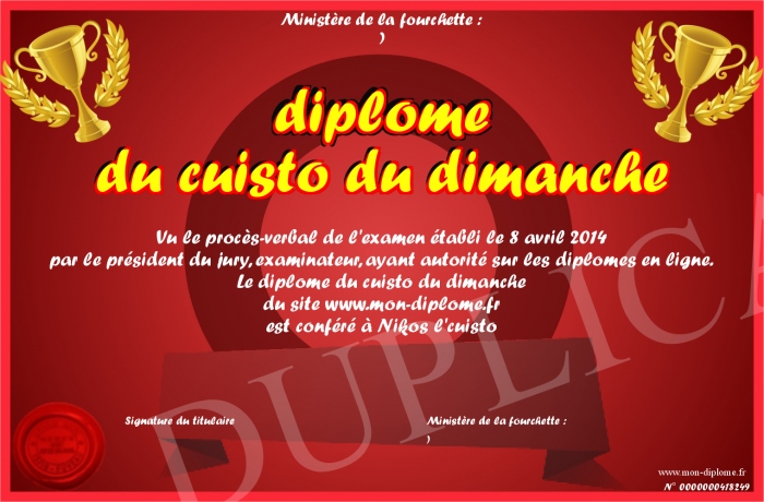 Envoyez par email votre diplome du cuisto du dimanche personalisé