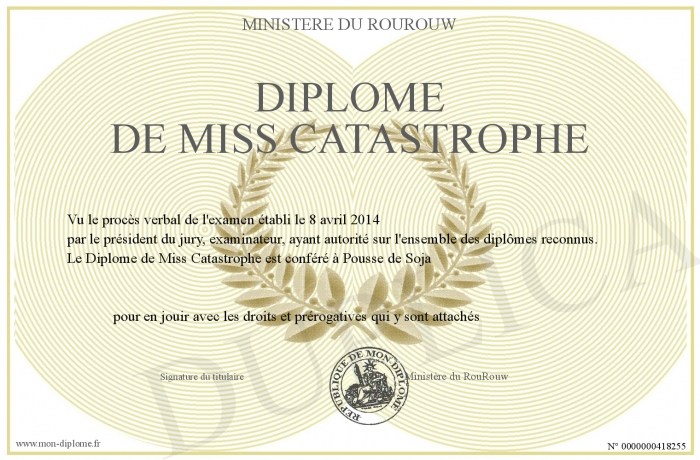 Envoyez par email votre Diplôme de Miss Catastrophe personalisé