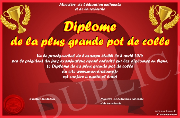 Envoyez par email votre Diplôme de la plus grande pot de colle personalisé