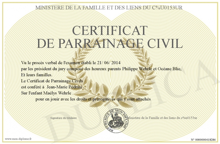 Envoyez par email votre Certificat de parrainage civil personalisé