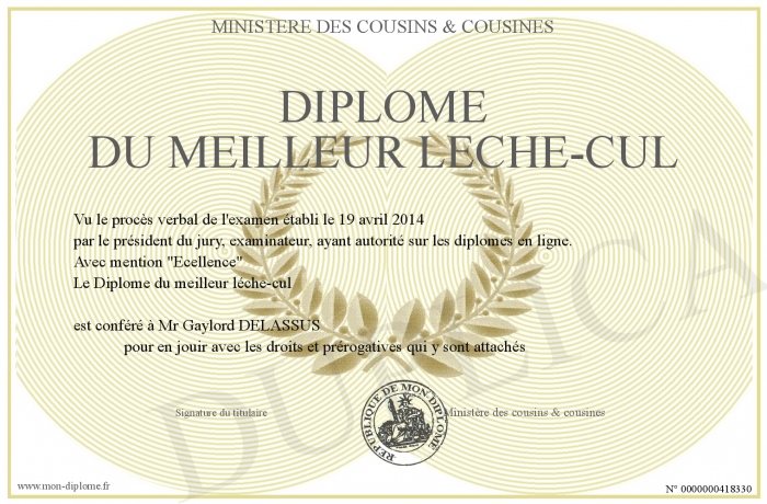 Envoyez par email votre Diplôme du meilleur léche-cul personalisé