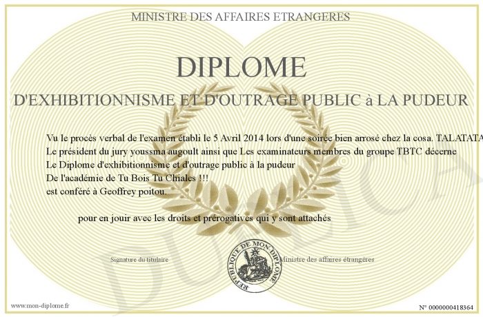 Envoyez par email votre Diplôme d'exhibitionnisme et d'outrage public à la pudeur personalisé