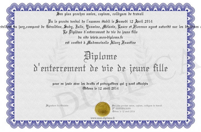 Envoyez par email votre Diplôme d'enterrement de vie de jeune fille personalisé