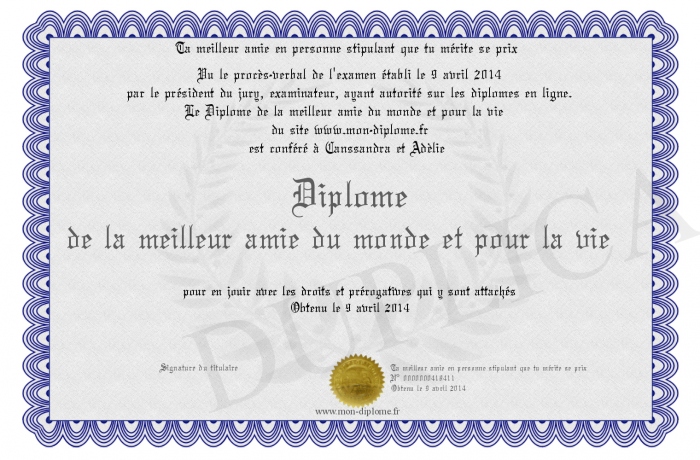Envoyez par email votre Diplôme de la meilleur amie du monde et pour la vie personalisé