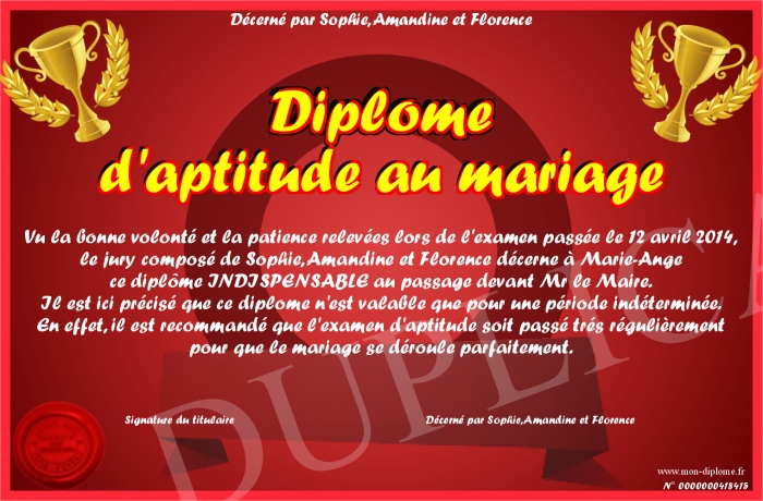 Envoyez par email votre Diplome d'aptitude au mariage personalisé
