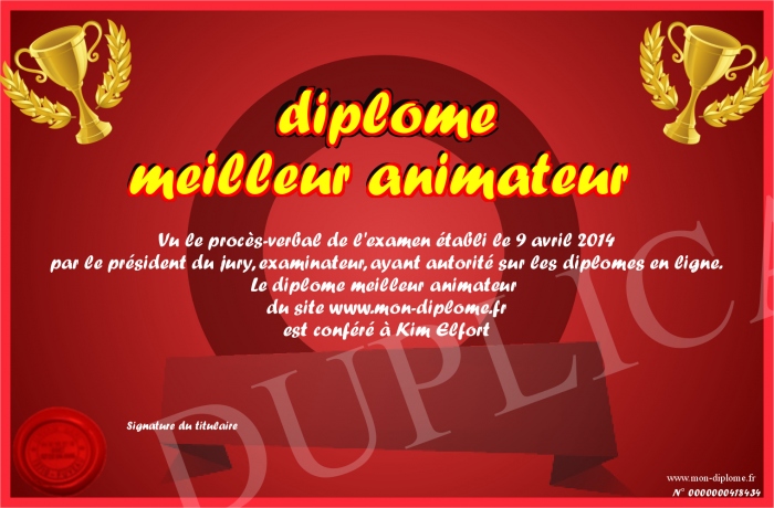 Envoyez par email votre diplôme meilleur animateur personalisé