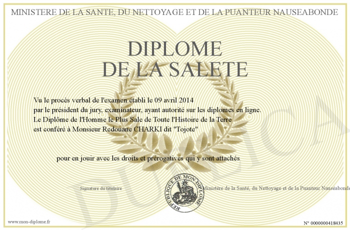 Envoyez par email votre Diplôme de la Saleté personalisé