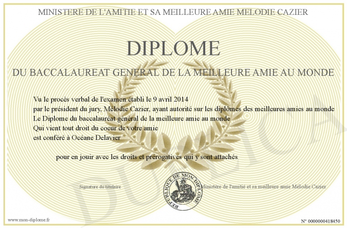 Envoyez par email votre Diplôme du baccalauréat général de la meilleure amie au monde personalisé