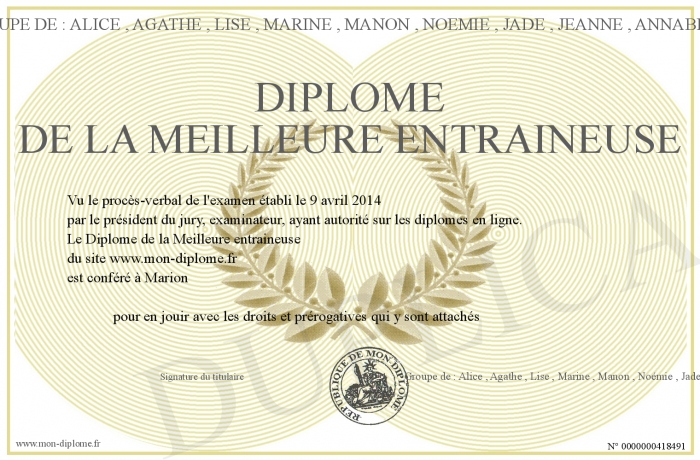 Envoyez par email votre Diplome de la Meilleure entraineuse personalisé