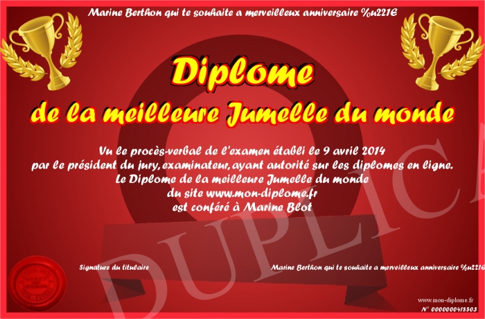 Envoyez par email votre Diplôme de la meilleure Jumelle du monde personalisé