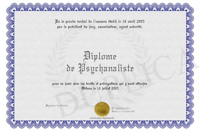 Envoyez par email votre Diplôme de Psychanaliste personalisé