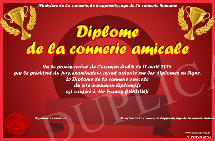 Envoyez par email votre Diplôme de la connerie amicale personalisé