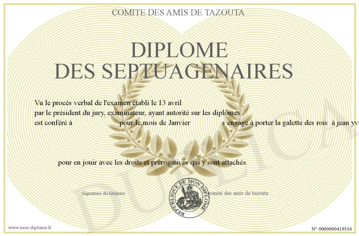Envoyez par email votre diplôme des septuagénaires personalisé
