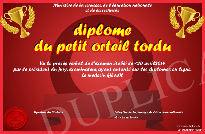 Envoyez par email votre diplome du petit orteil tordu personalisé