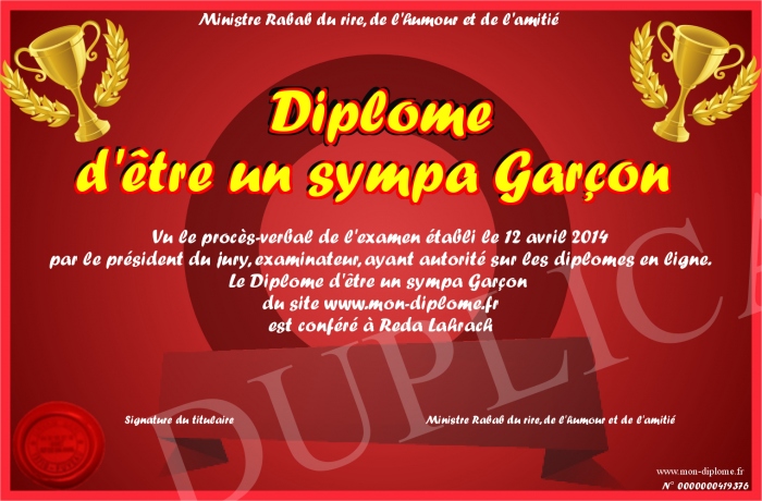 Envoyez par email votre Diplôme d'être un sympa Garçon personalisé