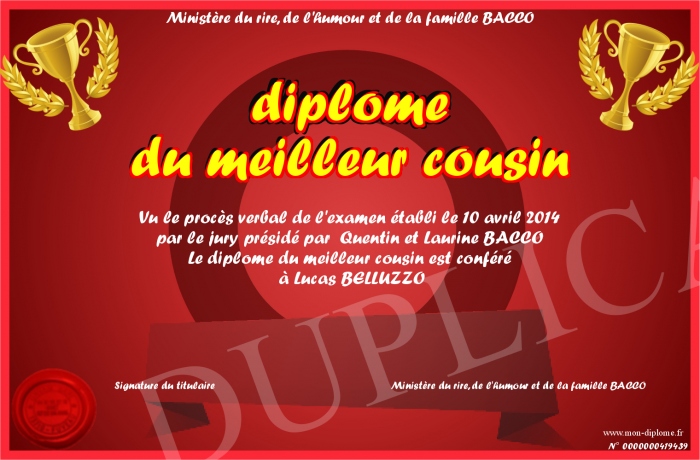 Envoyez par email votre diplome du meilleur cousin personalisé