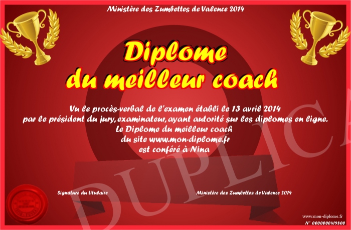 Envoyez par email votre Diplôme du meilleur coach personalisé