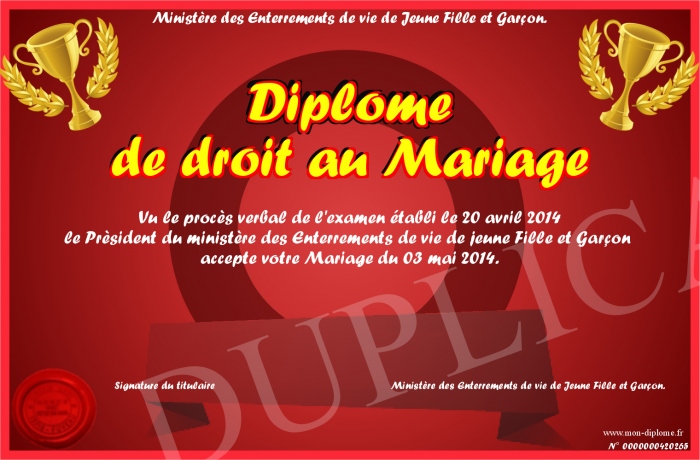 Envoyez par email votre Diplôme de droit au Mariage personalisé